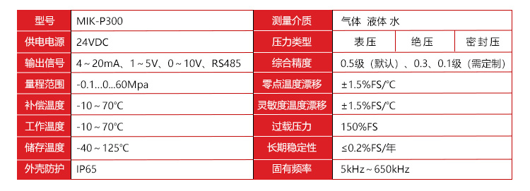 MIK-P300系列液位压力变送器压力敏感核心采用了高性能的硅压阻式压力充油芯体,内部的专用集成电路将传感器毫伏信号转换成标准电压、电流或数字信号,可以直接与计算机接口卡、控制仪表、智能仪表或PLC等方便相连。远距离传输可以采用电流或者485通讯输出方式。具有体积小、重量轻、全不锈钢密封结构。该产品安装方便简洁,具有非常好的抗振和抗冲击性能,广泛应用于过程控制、航空、航天、汽车、医疗设备、HVAC等行业的液体、气体的测量与控制。