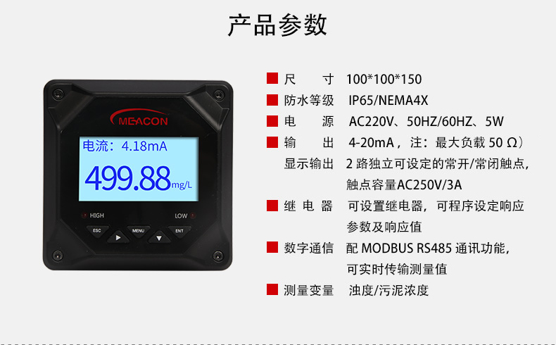MIK-PSS100传感器基于组合红外吸收散射光线法,应用ISO7027方法可以连续测定污泥浓度。按照ISO7027红外双散射光线技术不受色度影响测定污泥浓度值。根据使用环境可以选配带自清洗功能。数据稳定,性能可靠;内设自诊功能,保证数据准确;安装和校正简单。 MIK-PSS100控制器用于显示传感器所测得的数据,可以连接数字信号传感器或模拟信号传感器。用户可以通过控制器的界面配置和校准实现4-20mA模拟输出。可以实现继电器控制及数字通讯等功能。