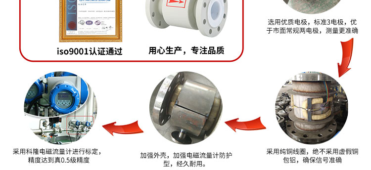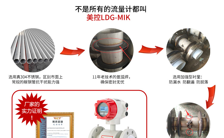 产品描述 Product Description 红外触摸式电磁流量计是根据法拉第电磁感应定律进行流量测试的流量计。电磁流量计的优点是压损极小,可测流量范围大。最大流量与最小流量的比值一般为10:1以上,适用的工业管径范围宽,最大可达3m,输出信号和被测流量呈线性,精确度较高,可测量电导率≥5μs/cm的酸、碱盐溶液、水、污水、腐蚀性液体以及泥浆、矿浆、纸浆等流体流量。 电磁流量计广泛应用于石油化工、钢铁冶金、给水排水、水利灌溉、水处理、污水处理站(环保污水控制、化工污水、电镀污水)、造纸(纸浆)、泥浆、医药、食品等工农业的生产公司过程流量测量和控制。