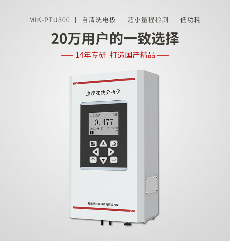 MIK-PTU300浊度在线分析仪是针对饮用水水质在线监测,量身研发的具有自主 知识产权的专利产品,具有超低浊度检出限、高精度测量、设备长时间 免维护、省水工作和数字化输出的特