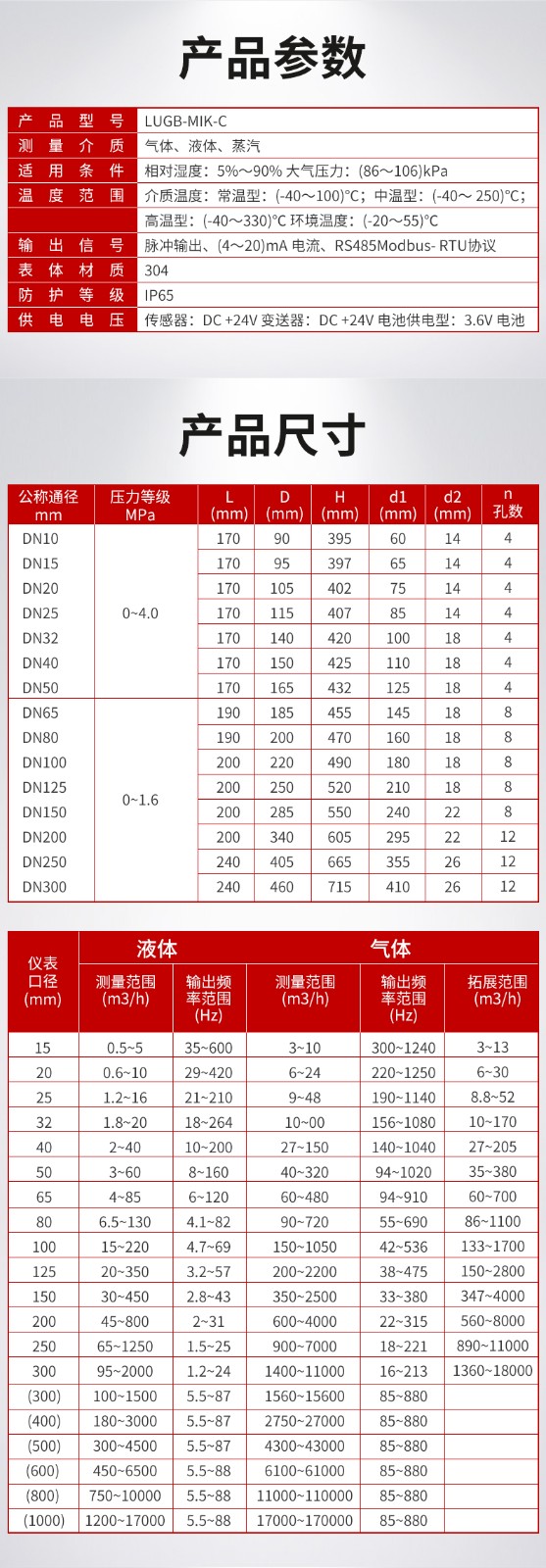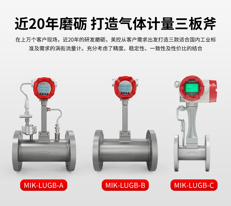 LUGB型涡街流量计是速度式流量计的一种,基于卡门(Karman)旋涡原理研究设计的,主要用于工业管道中介质流体的流量测量,如:气体、蒸汽或液体等多种介质的流量控制和计量。 LUGB型涡街流量计根据选型不同可以实现以下功能:测量工业管道介质流体的温度、压力、瞬时流量和累计流量等参数,并具有脉冲输出、(4~20)mA模拟信号输出、RS485通讯(Modbus RTU协议)、物联网GPRS等功能。 涡街流量计广泛应用于供热、供气、化工、环保、冶金、纺织、钢铁、医药、造纸、排水等厂矿企业对过热蒸汽、饱和蒸汽、压缩空气和一般气体(氮气、氦气等)、水和液体(如:导热油、液压油等)的计量和控制。