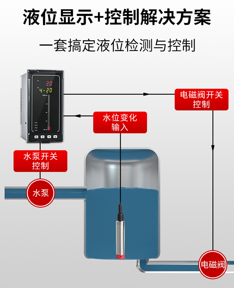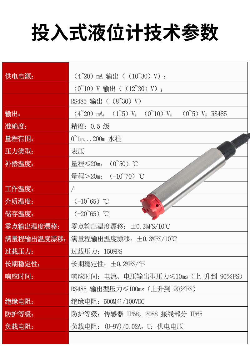投入式液位变送器由高性能扩散硅压阻式压力传感器作为测量元件,将与液位深度成正比的液体静压压力准确测量出来,并经过信号调理电路转换成标准(电流或 电压)信号输出,建立起输出信号与液体深度的线性对应关系,实现对液体深度的测量。