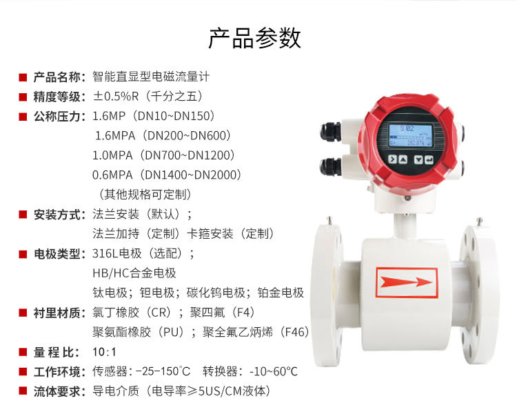 产品描述Product Description LDG-MIK升级款电磁流量计是根据法拉第电磁感应定律进行流量测试的流量计。电磁流量计的优点是压损极小,可测流量范围大。最大流量与最小流量的比值一般为10:1以上,适用的工业管径范围宽,最大可达3m,输出信号和被测流量呈线性,精确度较高,可测量电导率≥5μs/cm的酸、碱盐溶液、水、污水、腐蚀性液体以及泥浆、矿浆、纸浆等流体流量。 电磁流量计广泛应用于石油化工、钢铁冶金、给水排水、水利灌溉、水处理、污水处理站(环保污水控制、化工污水、电镀污水)、造纸(纸浆)、泥浆、医药、食品等工农业的生产公司过程流量测量和控制。